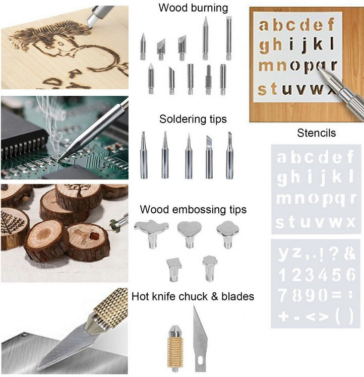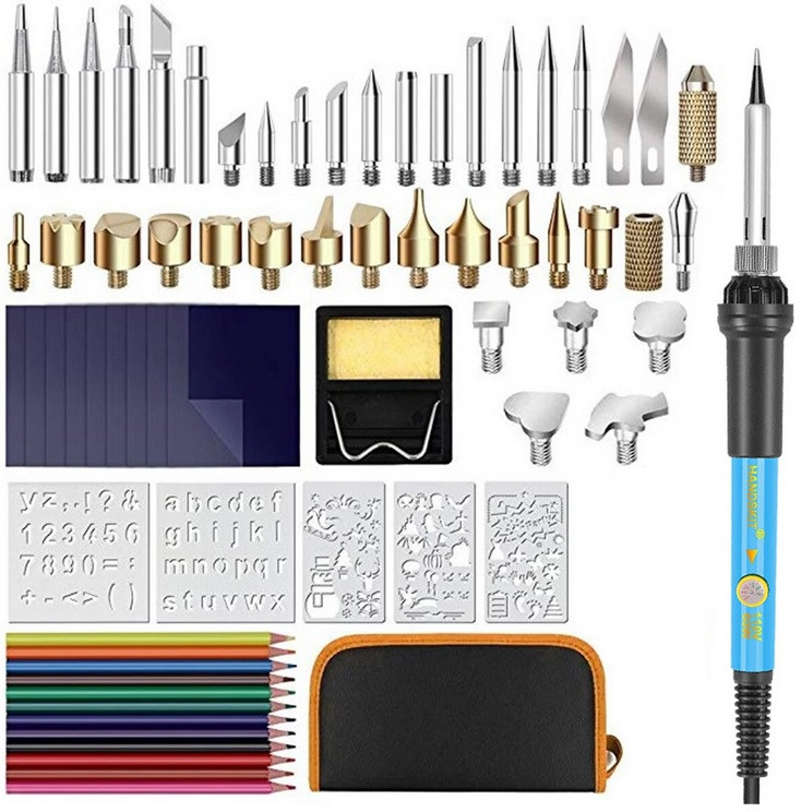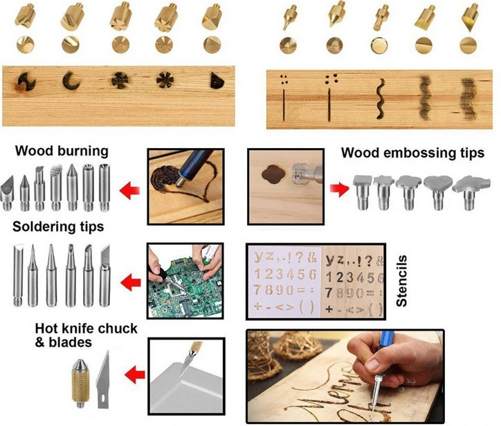 Cserélhető hegyek: A készlet többféle hegyet tartalmaz, amelyekkel sokféle technikát alkalmazhatsz – égetés, domborítás, vésés, forrasztás stb.