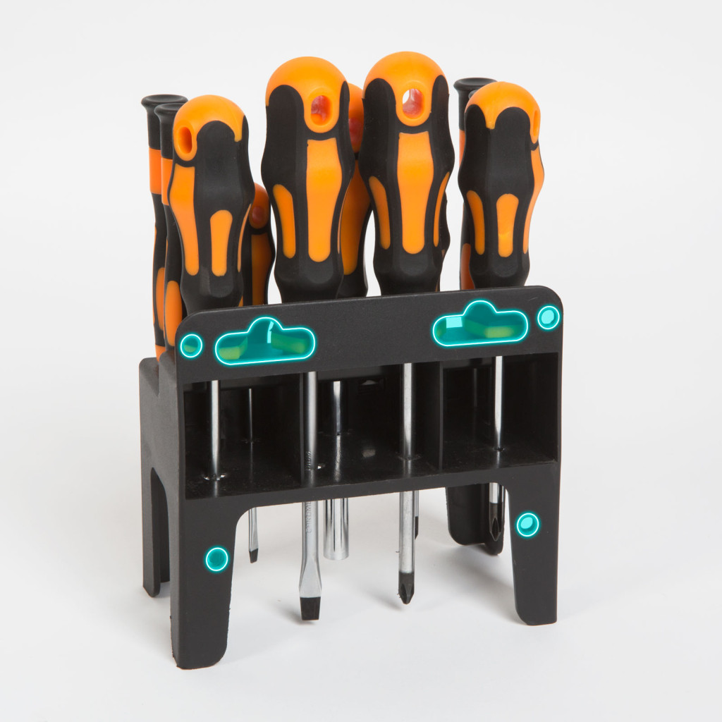 A Handy csavarhúzó készletével könnyedén és gyorsan dolgozhat. A szárak nagy szilárdságú CR-V anyagból készültek, így ellenállnak a kopásnak. Az ergonomikus, csúszásgátló anyagból készült nyél, kényelmes és biztonságos munkavégzést garantál. A fali/asztali tárolónak köszönhetően mindig jól áttekinthetőek a szerszámai.
