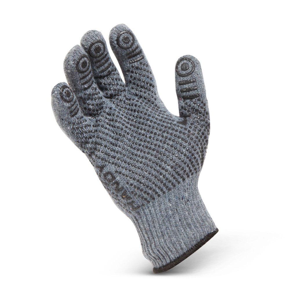 Pamutból készült, gumis mandzsettájú kesztyű, csúszásmentes gumi pöttyözéssel a tenyerén.