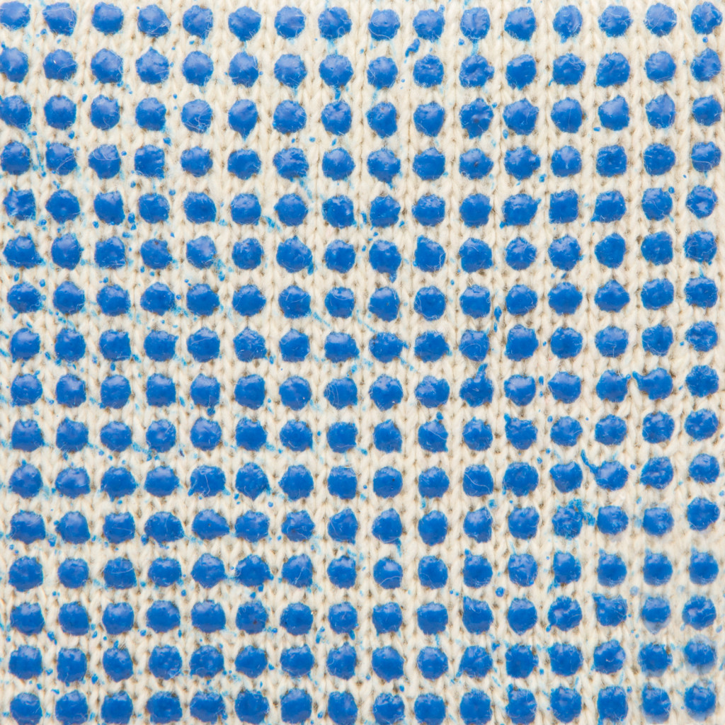 Pamutból készült, gumis mandzsettájú kesztyű, csúszásmentes gumi pöttyözéssel a tenyerén.