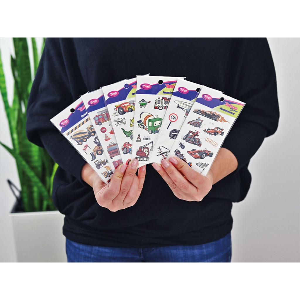 Minden ami autó! Könnyen felvihető, egyszerű és látványos tetkók, járműves mintákkal, szettben. Az igazi járgány fanatikus gyerekeknek. Ezek az ideiglenes tetoválás matricák kiváló minőségűek, így hosszabb ideig, napokig is megőrzik élénk színüket és részletgazdagságukat. Könnyen felhelyezhetőek és eltávolíthatóak, anélkül hogy irritálnák vagy károsítanák a bőrt. 53 db Járműves matrica tetoválás 6 db íven sport autók, világítós autók, munkagépek, tűzoltók, rendőrautók. Minden, ami jármű!