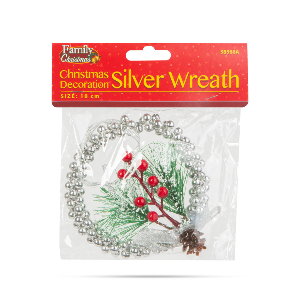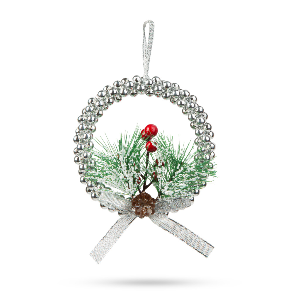 Ezzel a csillogó ezüst koszorúval könnyedén feldíszítheti otthonát a karácsonyi időszakban! Az ezüst színű akasztóval egyszerűen felakaszthatja a kívánt helyen. Alkalmas karácsonyfadíszként, de ajtódíszként vagy bármilyen karácsonyi dekorációban is megállja a helyét. A díszt, élénk színű piros bogyók, ezüst színű masni és havas zöld ág és toboz teszi igazán karácsonyi hangulatúvá. Az ezüst színű koszorú univerzális és időtálló, így bármilyen karácsonyi dekorációval és stílussal tökéletesen harmonizál.