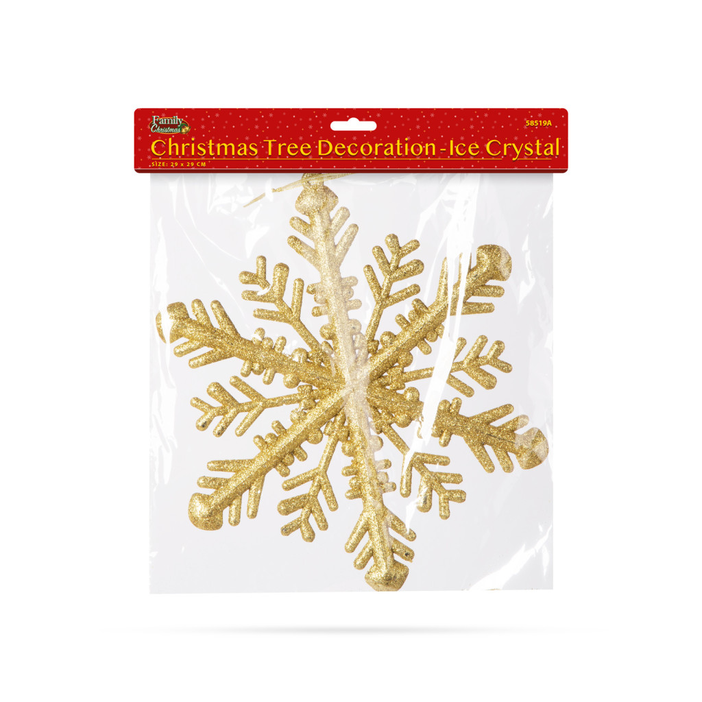 Ez a csillogó jégkristály karácsonyfadísz egy igazán gyönyörű és elegáns kiegészítője lehet a karácsonyi dekorációjának. A nagyméretű dísz szikrázó, csillogó felületének köszönhetően különleges megjelenést kölcsönöz a fának. A dísz erős, tartós ugyanakkor rugalmas anyagból készült, amely biztosítja, hogy hosszú évekig használható legyen. A dísz akasztóval rendelkezik, amely segítségével könnyen és biztonságosan rögzíthető a karácsonyfa ágaira. Ez a nagyméretű glitteres jégkristály garantáltan felkelti majd az emberek figyelmét és gyönyörűen fog mutatni a karácsonyi dekorációban.