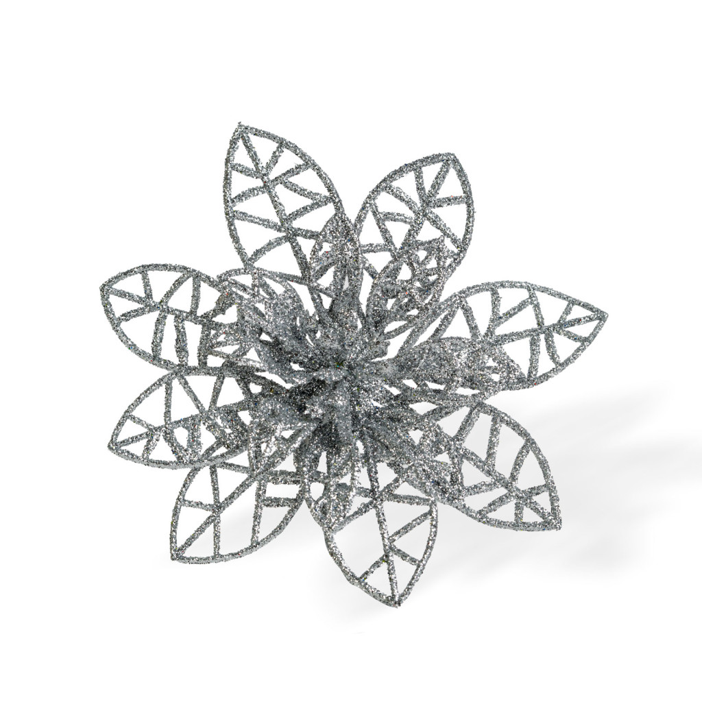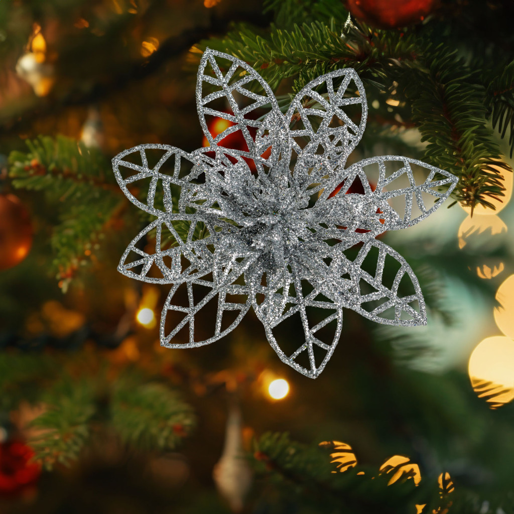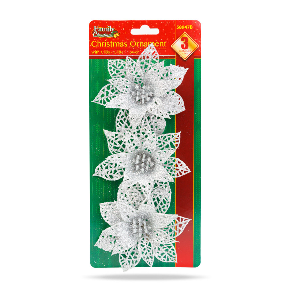Különleges karácsonyi dekorációs termék, amely csipesz segítségével rögzíthető. A virág csillámos, glitteres felülettel rendelkezik. A csipeszes rögzíthetőségnek köszönhetően széles körben alkalmazható, ideális lehet karácsonyfák, girlandok, kopogtatók és adventi koszorúk díszítésére is.
