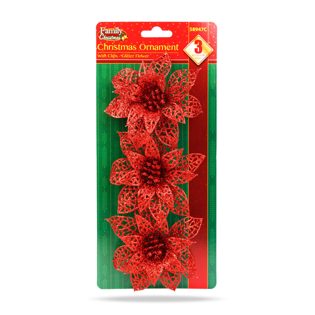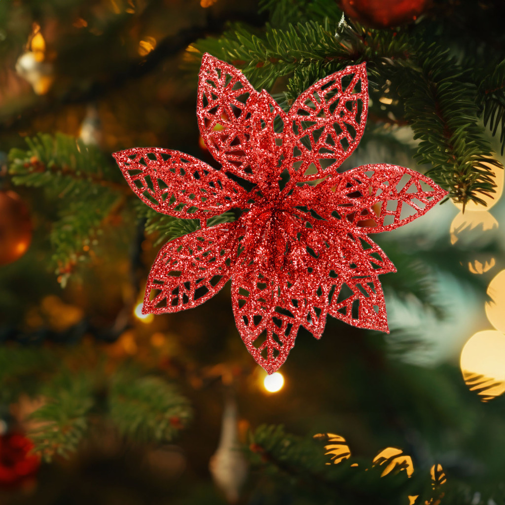 Különleges karácsonyi dekorációs termék, amely csipesz segítségével rögzíthető. A virág csillámos, glitteres felülettel rendelkezik. A csipeszes rögzíthetőségnek köszönhetően széles körben alkalmazható, ideális lehet karácsonyfák, girlandok, kopogtatók és adventi koszorúk díszítésére is.