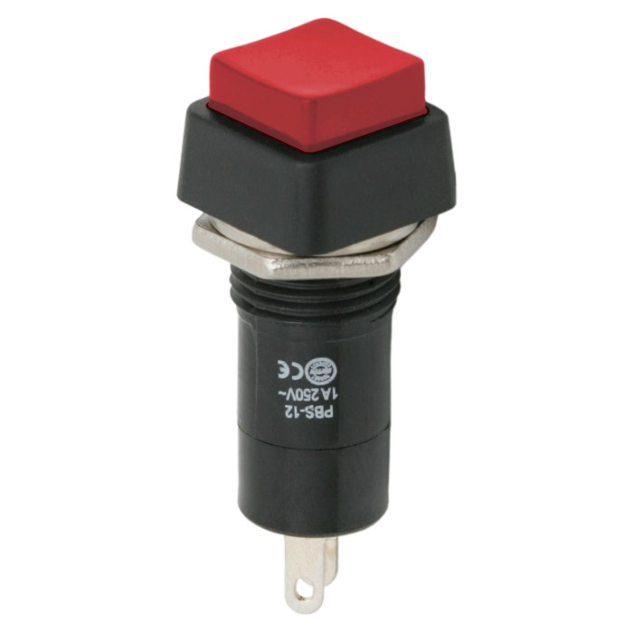 Beépíthető piros, négyzet alakú nyomókapcsoló. Széles körben elterjed, beépíthető műszaki / elektromos készülékek kezelőpaneljébe. Megbízható, jó kapcsolási érzet jellemzi.