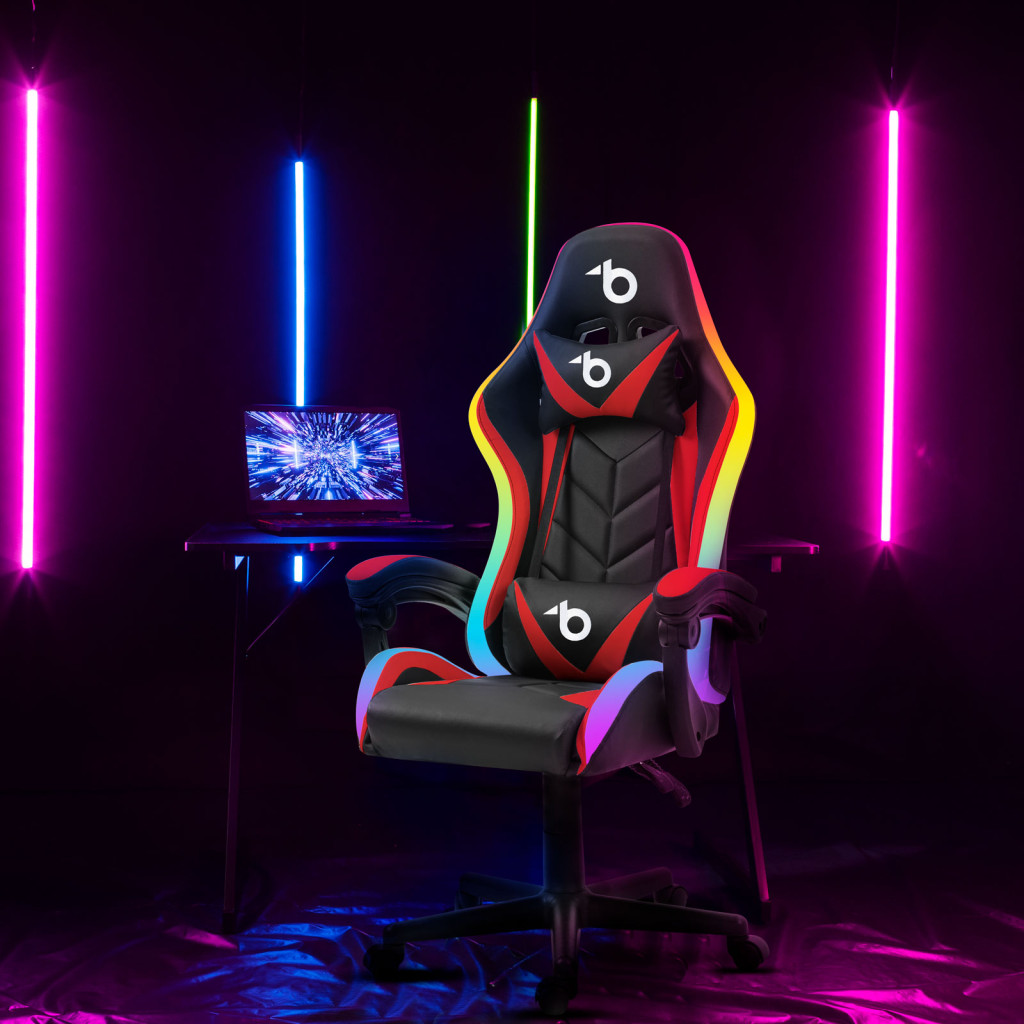 Versenyülés megjelenésű, ergonómikus kialakítású gamer szék állítható színű RGB LED-del. A megfelelő harmónia megteremtéséhez ugyanolyan színre tudja állítani a billentyűzetének, egerének, fejhallgatójának és a székének világítását is. A nagy oldaltartással rendelkező ülőfelület, a derékpárna, a nyakpárna és a magasított hátrész hosszantartó, kényelmes ülést biztosít, ezáltal nemcsak gamer-eknek, de folyamatos irodai munkát végzőeknek is ajáljuk. Használatával megelőzhetőek a derékfájdalmak, hátfájdalmak kialakulása. A dönthető, versenyülés háttámla és a párnák igazán stílusos megjelenést kölcsönöznek.