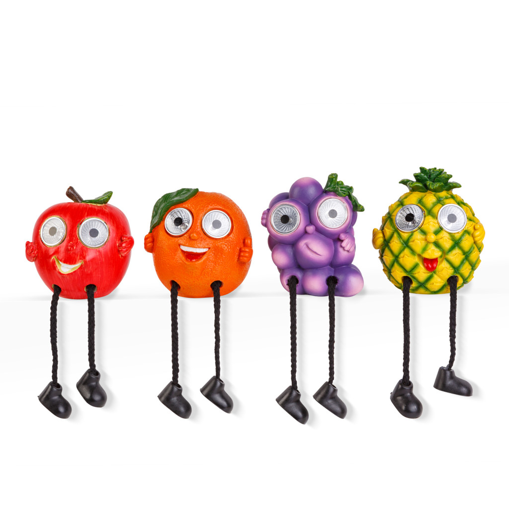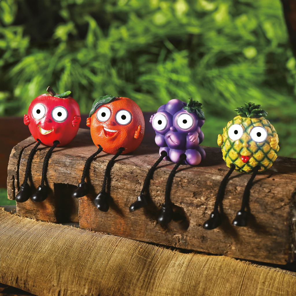 Dobja fel kertjét vagy teraszát ezekkel a vidám szolár gyümölcsökkel! Négy különböző, mókás figurából választhat, úgy mint narancs, szőlő, alma vagy ananász, mindegyik forma szeme világít. A beépített, hidegfehér LED-ek automatikusan felkapcsolnak szürkületkor és nagy fényerővel világítják meg környezetüket. Nincs szükség külső áramforrásra, elemcserére, a szolár panelen keresztül napenergiával töltődik fel az akkumulátor. Tökéletes választás, ha mosolyt szeretne csalni vendégei arcára, vagy ha egy igazán különleges kertre várgyik!