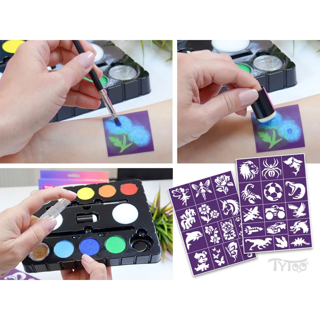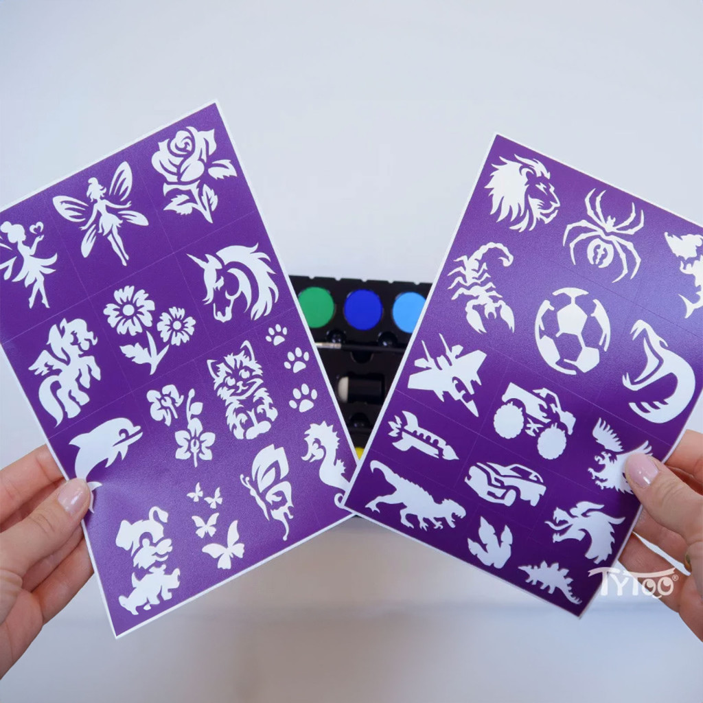 | Csomag tartalma: | 8 arcfesték (4 g / szín) 2 csillámpor (1,5 g / szín) 2 ecset 2 szivacs 1 ujjra húzható szivacs 2 sablonív (összesen 29 db fiús és lányos minta) |