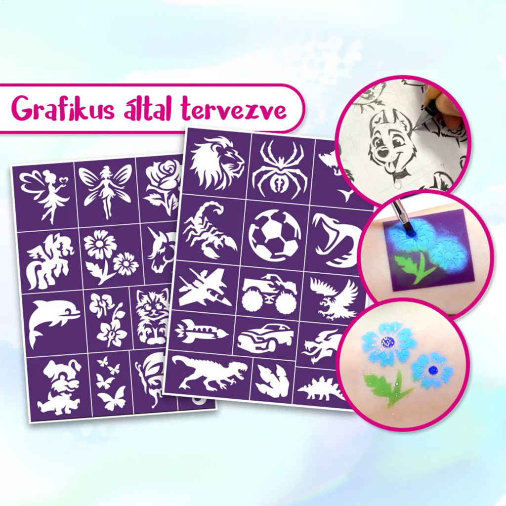 Ez a szett a legkisebb arcfestő készletünk, de most még többet nyújt, mint eddig! Az alapvetően szükséges eszközök mellett, most ujjra húzható szivacsot talál benne a még egyszerűbb festésért, valamint két öntapadós sablonívet, amelyeken összesen 29 különféle minta található – külön lányosabb és fiúsabb motívumokkal, hogy minden gyerek megtalálja kedvencét.