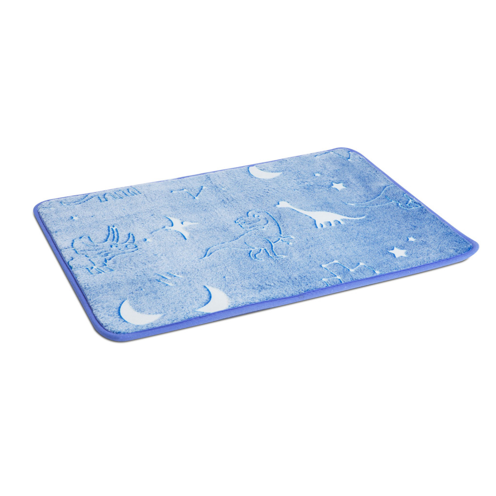 Pamutból készült, éppen ezért extra puhasággal rendelkező szőnyeg. A gyermekek köztudott, hogy szeretnek a földön játszani, így ideális minden gyerekszobába, de alkalmas lehet fürdőszobák díszeként is. A szőnyeg foszforeszkáló pigmenteket tartalmaz, így természetes és mesterséges fény hatására is feltöltődik, sötétben pedig zöldes fénnyel ragyog. Az élénk kék szín és a dinoszauruszos minta vidám hangulatot varázsol bármely helyiségbe. A csúszásmentes, gumis hátoldalnak köszönhetően nem mozdul el, biztonságosan használható.