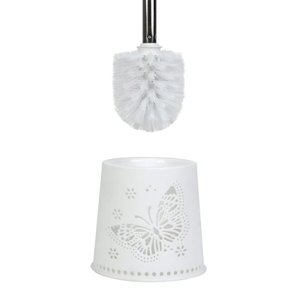 Praktikus WC-kefe + tartó szett matt fehér színben, pillangóval díszítve az oldalán. A tartó stabilitást és tartósságot nyújt a kefe számára. A kefe, fényes, ezüst színű nyéllel rendelkezik, amely könnyedén használható és kényelmes fogást biztosít. A WC-kefe hatékonyan segít a higiénia fenntartásában, míg a tartó gondoskodik a kefe biztonságos tárolásáról.