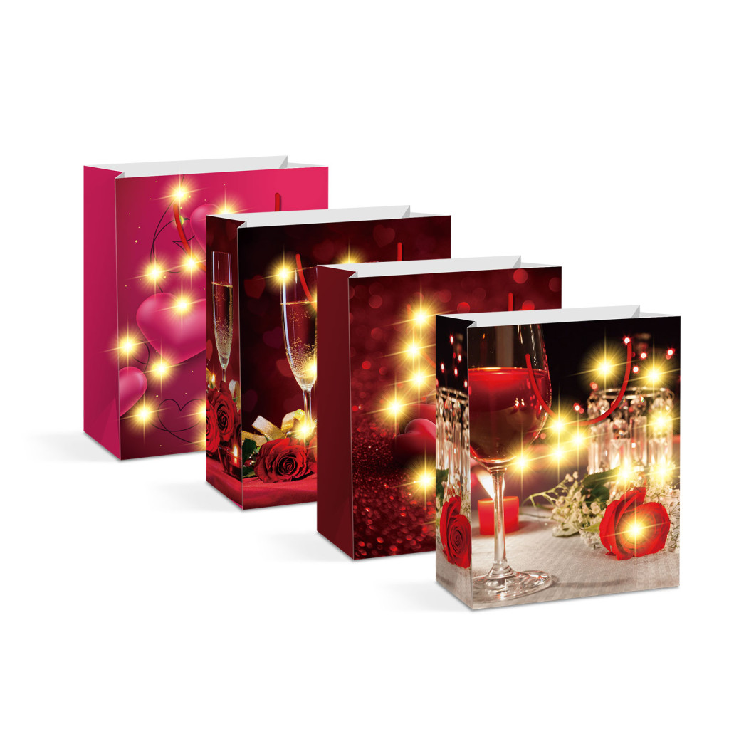 Az ajándéktasak oldalát különleges minta díszíti és kiváló minőségű papírból készült, hogy hosszútávon is tökéletesen szolgáljon. A tasakon elhelyezett LED-ek különleges hangulatot teremtenek, melyek energiájáról a beépített elemek gondoskodnak.